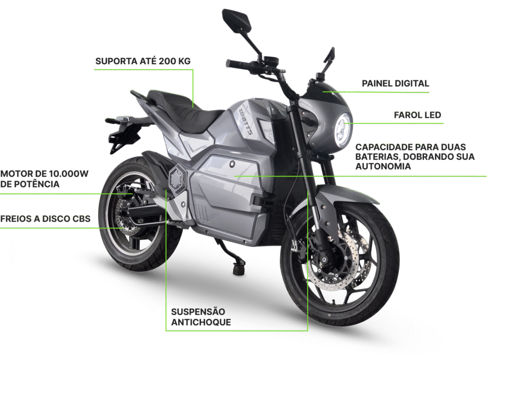 Velocidade de até 90 km/h e autonomia de até 60km.